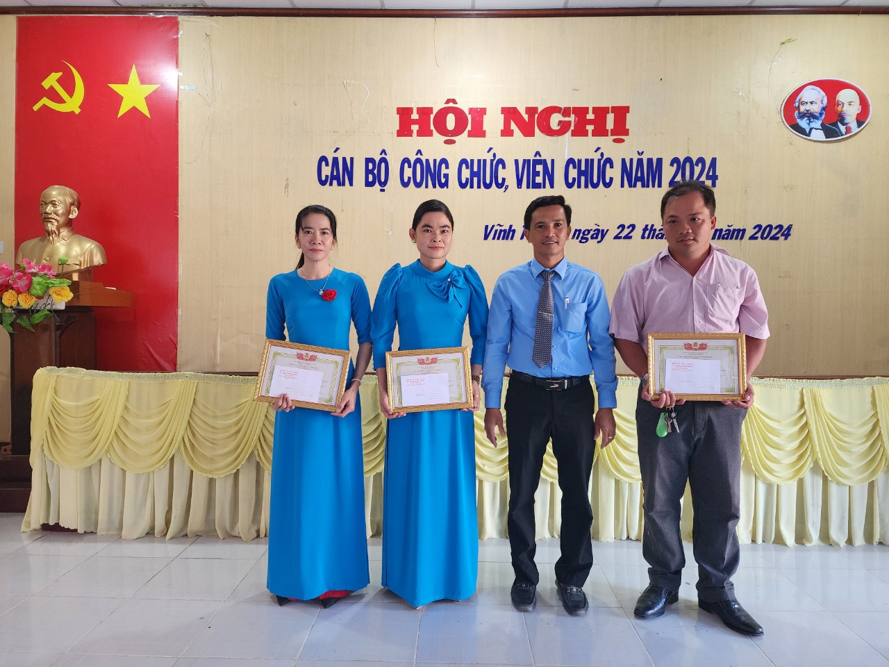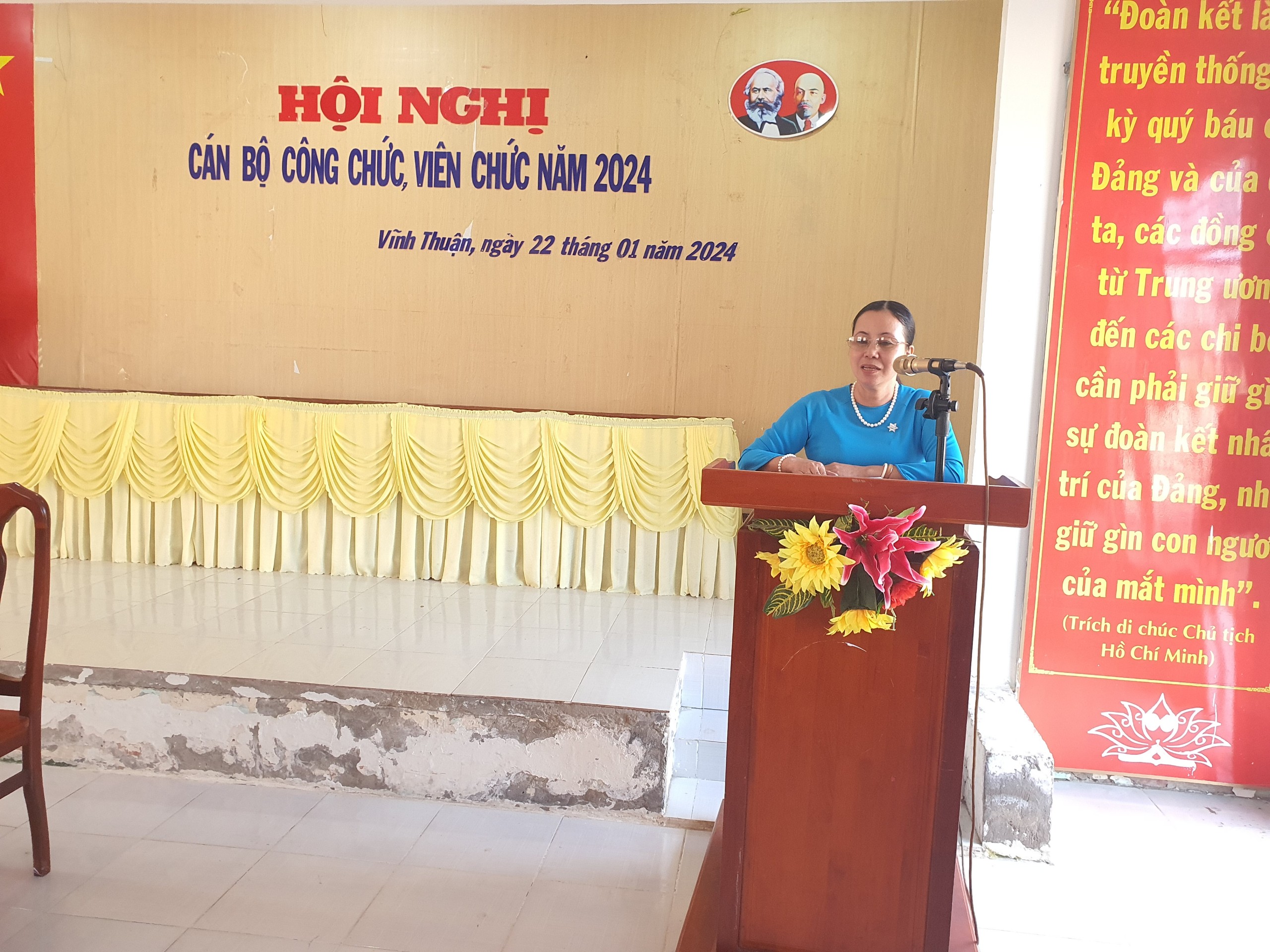 Thực hiện Công văn số 34/LĐLĐ, ngày 22/12/2023 của Ban Thường vụ Liên đoàn lao động huyện Vĩnh Thuận về việc phối hợp tổ chức Hội nghị cán bộ công chức, viên chức người lao động năm 2024. Chiều ngày 22/01/2024, CĐCS xã phối hợp với UBND xã tổ chức Hội nghị cán bộ công chức, viên chức năm 2024. Dự và chỉ đạo Hội nghị có đ/c Phan Thị Cẩm, HUV, Bí thư Đảng ủy xã; đ/c Tôn Quốc Hòa, PBT. Đảng ủy, CT. UBND xã; đ/c Đặng Văn Toàn, PCT. HĐND, CT. CĐCS xã; cùng toàn thể đoàn viên công đoàn, các Ngành đoàn thể, Công an, Quân sự xã.
